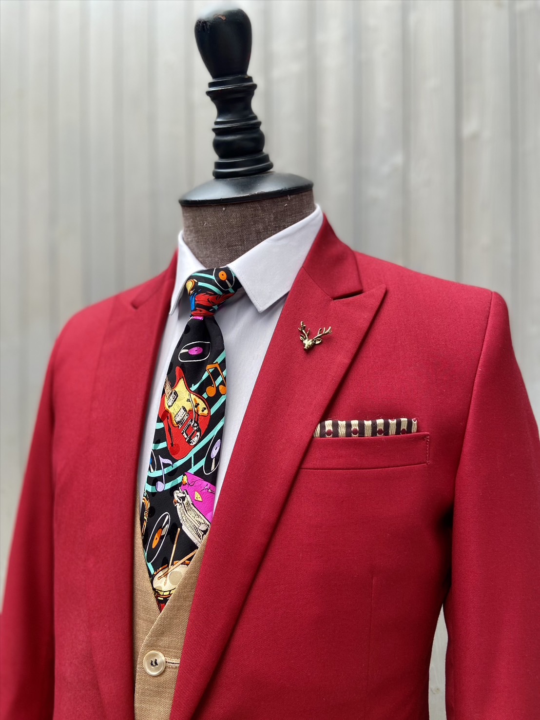 芳芳特意加入了有趣的印花領帶和金色鹿頭領針,這些精心挑選的配件增添了穿搭小心機,也讓整體造型更加個性化,讓穿著者在遵守主題派對的規範之餘,還能展現個人風格。