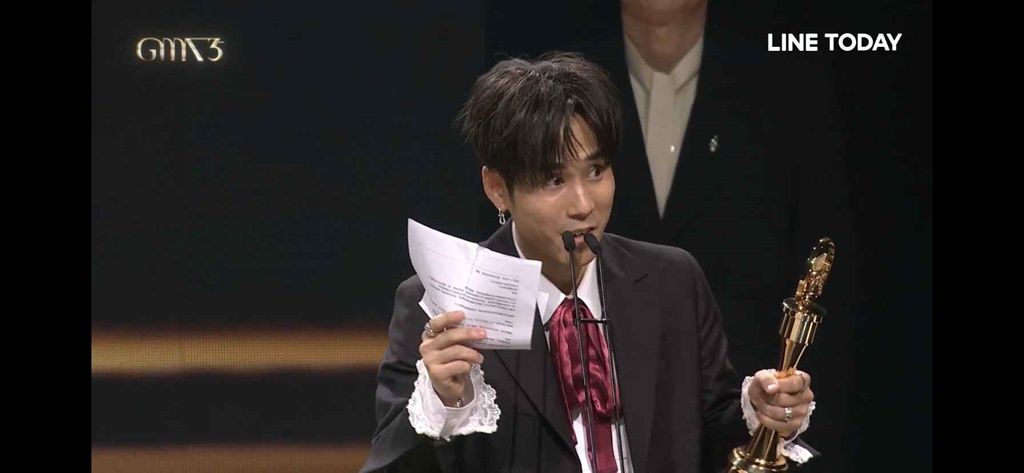 又是一個星光熠熠的夜晚,金曲紅毯上片山凉太以特殊剪裁西服造型,搭配白襯衫和醒目的紅色領結相映成趣。