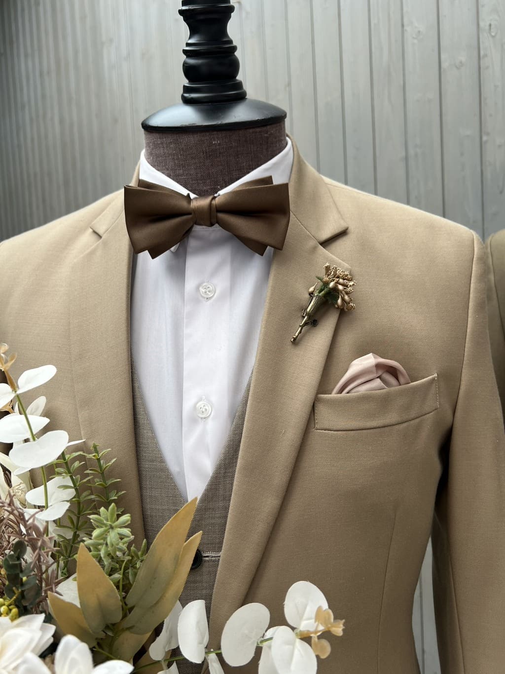 搭配上深棕色領結與小巧胸花,在細節中增添層次感,也讓整體造型更具自然質感與典雅氛圍。胸前的粉嫩口袋巾與花束互相呼應,細膩之處透露出精緻與品味。