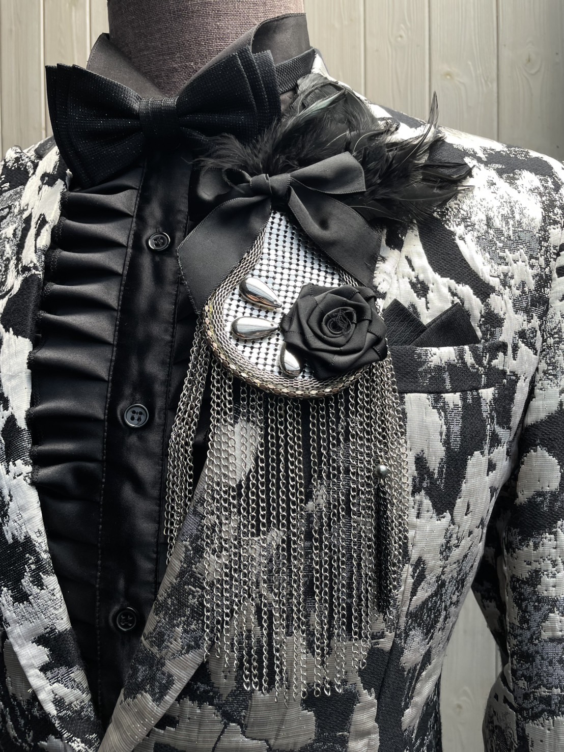 在配件上,Oli建議採用同一色系,並充分利用不同位置的細節來增添層次感,例如統一黑白色系的領結、口袋巾與胸針。